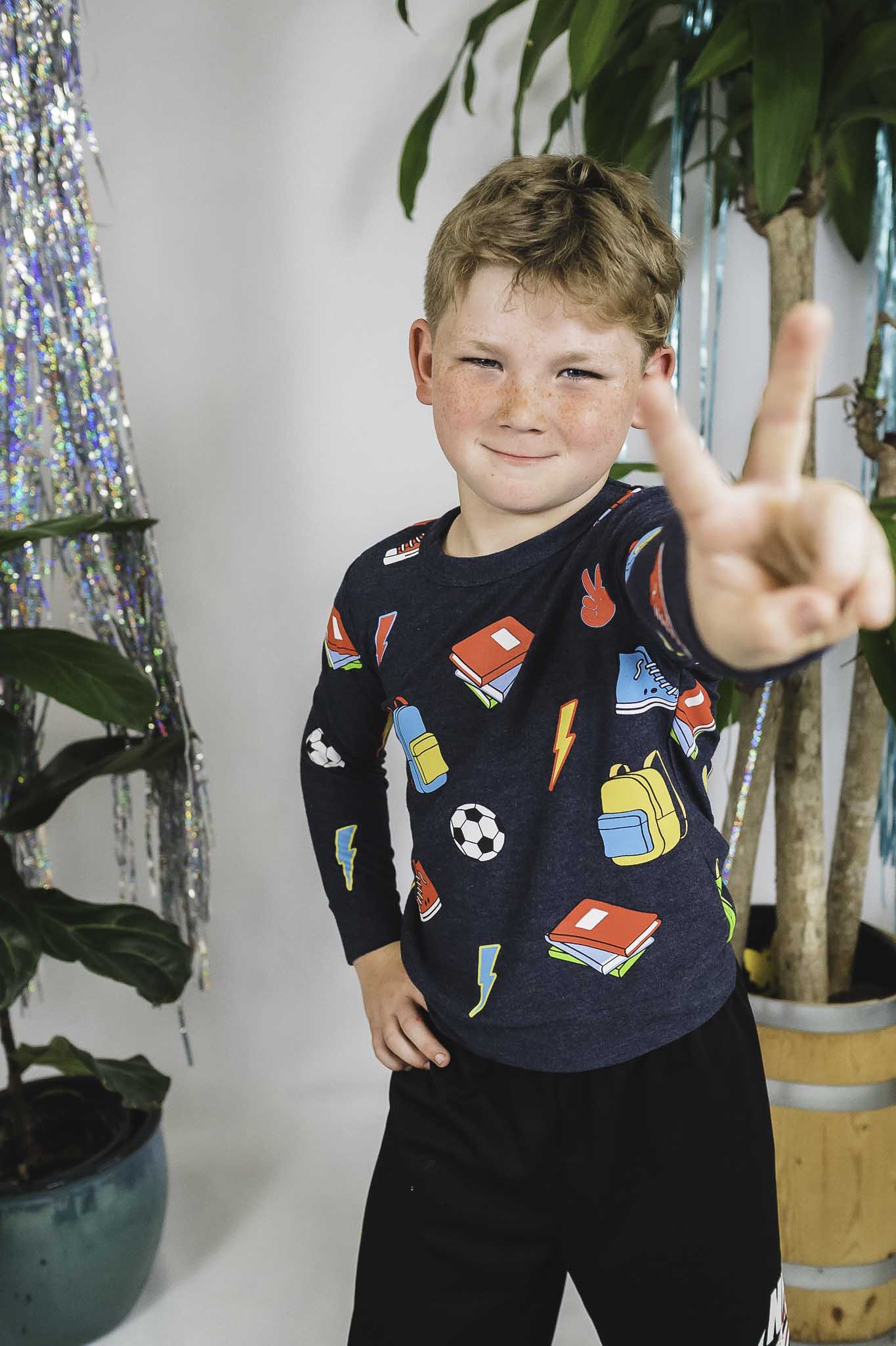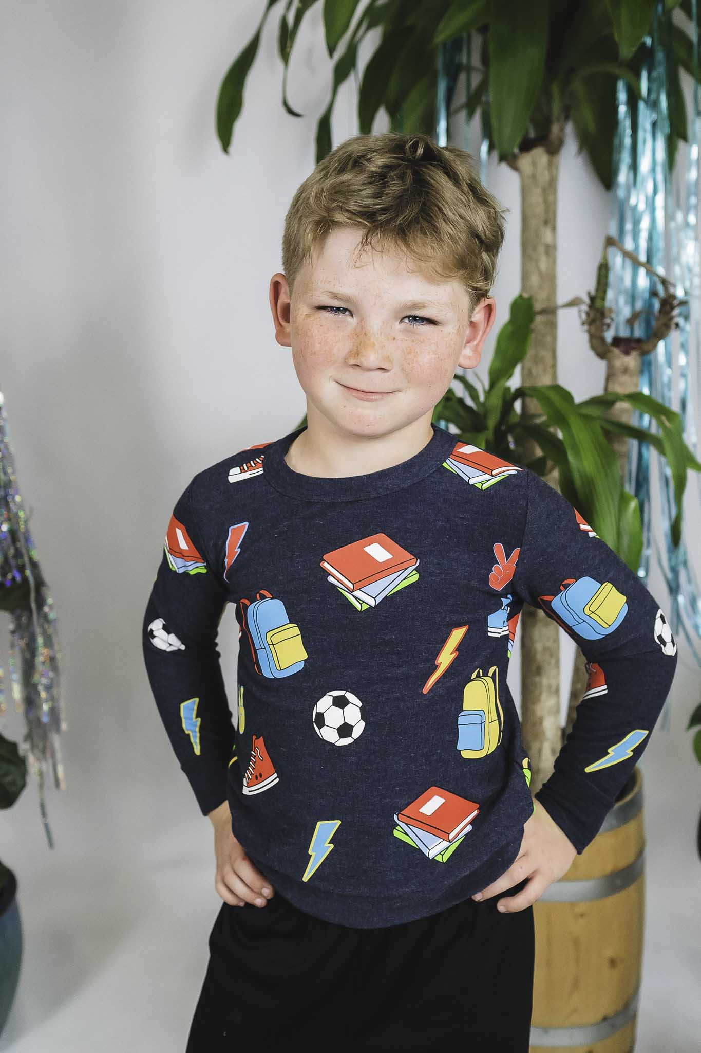 This pullover sweatshirt from Chaser brightens up back-to-school season! It comes in a navy-blue hue and features school motifs printed throughout.